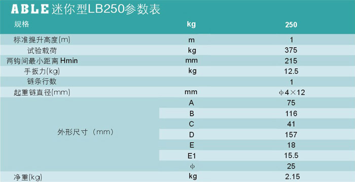 艾培尔LB250型迷你手扳葫芦参数: