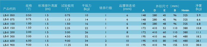 艾培尔LB-II型德国款式环链手扳葫芦参数: