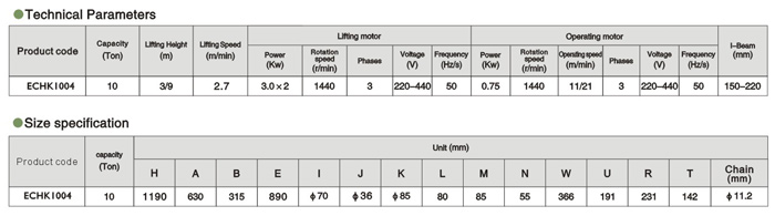 艾培尔ECHK电动葫芦20T电动葫芦具有结构紧凑、自重轻、体积小、操作方便、易于维护等特点。电动葫芦既可以单独安装在架空工字梁上,也可以配套安装在电动或手动单梁、双梁、悬臂、龙门等起重机上。